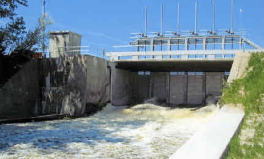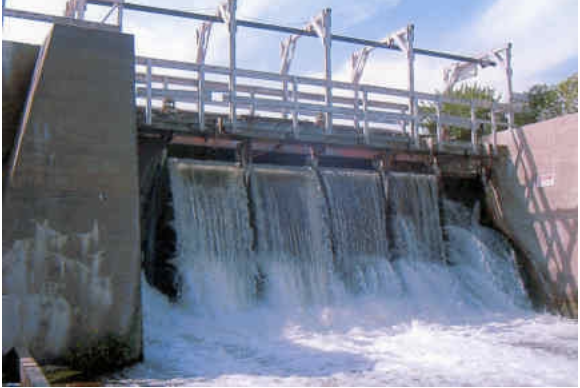 The top photo was taken of the dam prior to the completion of the renovation. The newly renovated dam is pictured at left. The gates are computerized and only allow enough flow to keep the water level of the lake within 1/2 inch at all times.